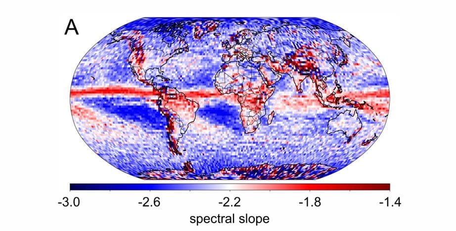 By using this technique, we were able to build the first consistently generated local maps of spectral slope in the mesoscales (the scales where the odd -5/3 slope appears in the global average). We did this at two pressure levels, 200 and 600 hPa. Of these, 200 hPa is the most relevant to the original discussion of the Nastrom and Gage results, but I’ll show 600 hPa, which is right in the troposphere and also very interesting (Figure 3). Redder regions have flatter distributions of energy, that is, relatively more energy in the smaller scales.